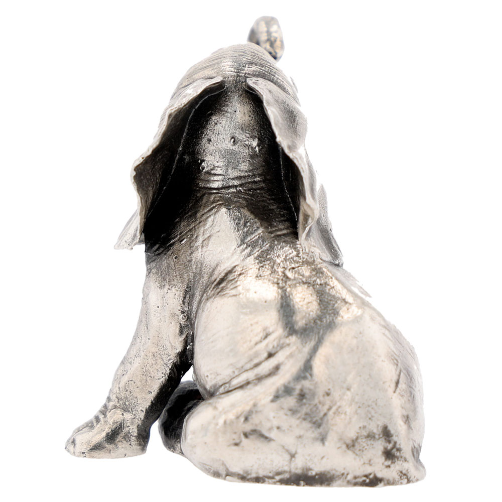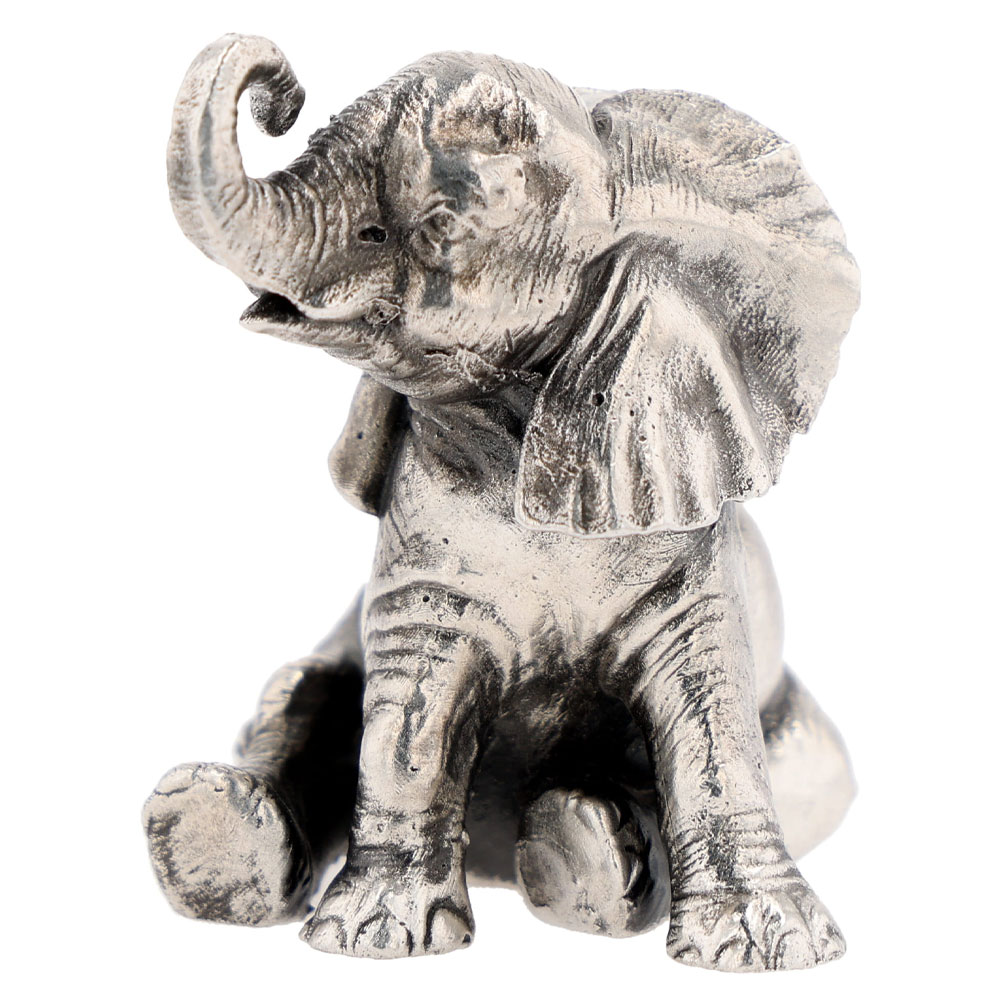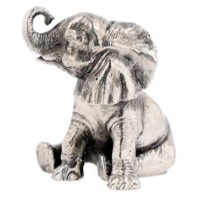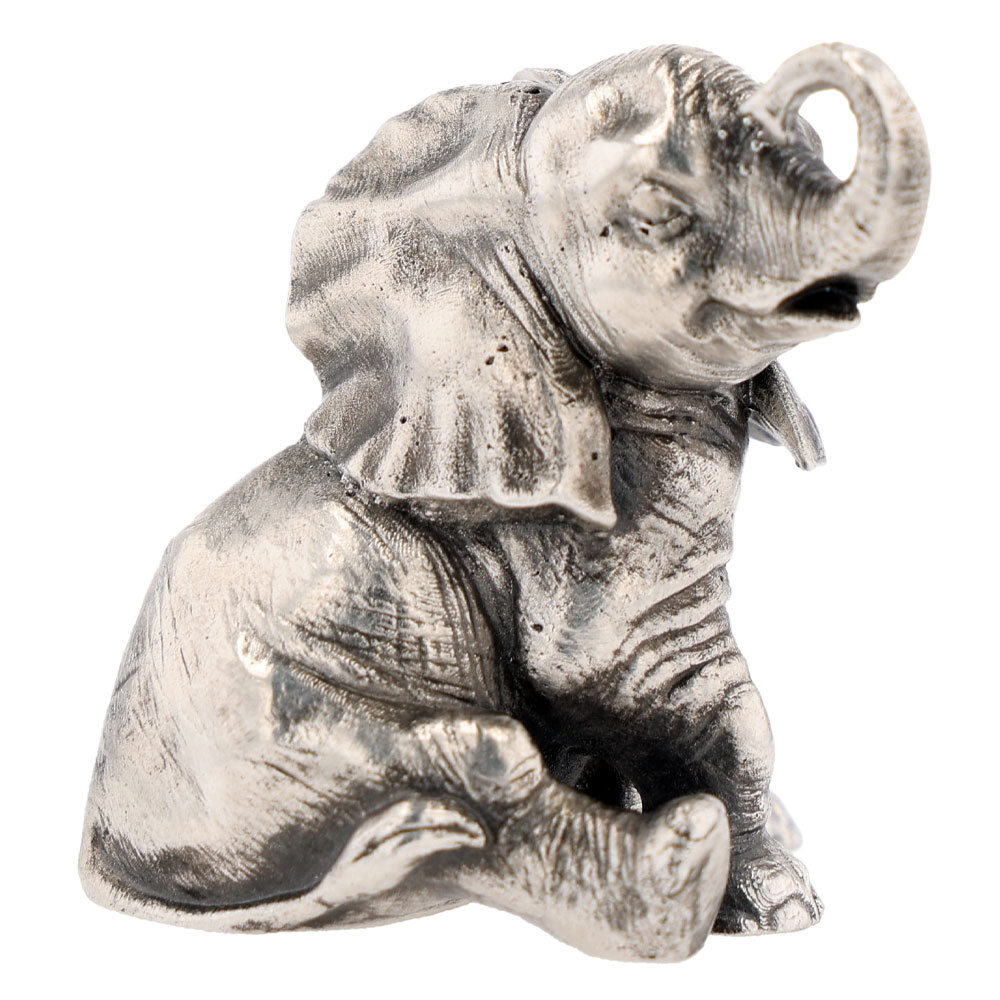 This 3 oz Antique Finish Baby Elephant Silver Statue features a baby elephant with its trunk raised while sitting back on its hind legs. Its youthful appearance is captured with large ears and a round head. At this stage of life, its trunk is still developing, and everyday tasks like using it to drink water are still being learned.