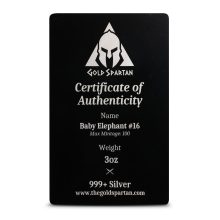 The 3 oz Antique Finish Baby Elephant Silver Statue by Gold Spartan ships in a protective box and is accompanied by a Certificate of Authenticity. The antique finish adds depth and character to the design, and each statue includes laser-engraved markings, such as the serial number and mint details. Hand-pouring gives each statue its own slight differences in finish, meaning no two silver statues are ever exactly the same.