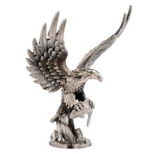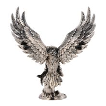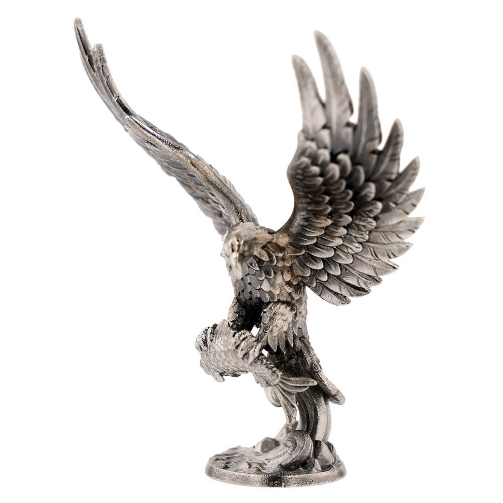 The bald eagle in this 3 oz Antique Finish Eagle Silver Statue is shown in the act of a successful catch. The bird is perched on a tree stump, wings partly spread, gripping a freshly caught fish in its talons. With talons that can produce up to 400 pounds of pressure per square inch, bald eagles are capable of capturing and holding onto even the most slippery prey.