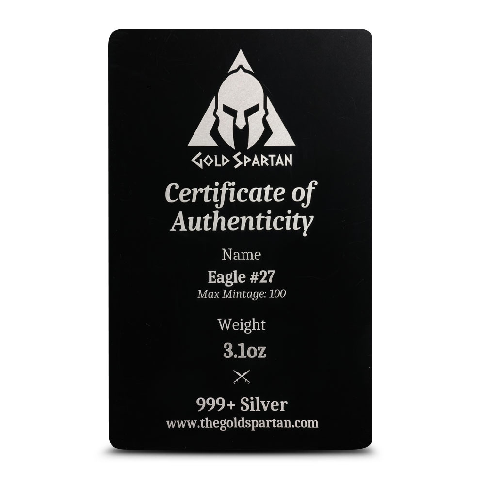 Each 3 oz Antique Finish Eagle Silver Statue from Gold Spartan comes in a secure box and includes a Certificate of Authenticity. These statues feature an antique-style finish that brings out fine details in the silver. Each one has its own laser-engraved hallmarks and serial number, and because theyre hand-poured, no two look exactly the same.
