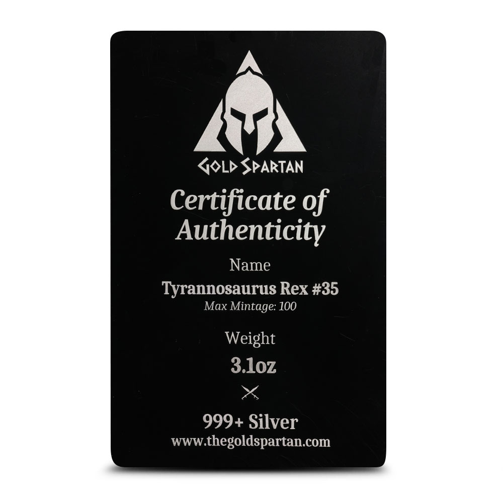 Each 3 oz Antique Finish Tyrannosaurus Rex Silver Statue from Gold Spartan comes in a protective box and includes a Certificate of Authenticity. Because they are handcrafted, every statue has slight differences that give it a one-of-a-kind feel. The antique polish adds a classic finish that enhances its overall design.