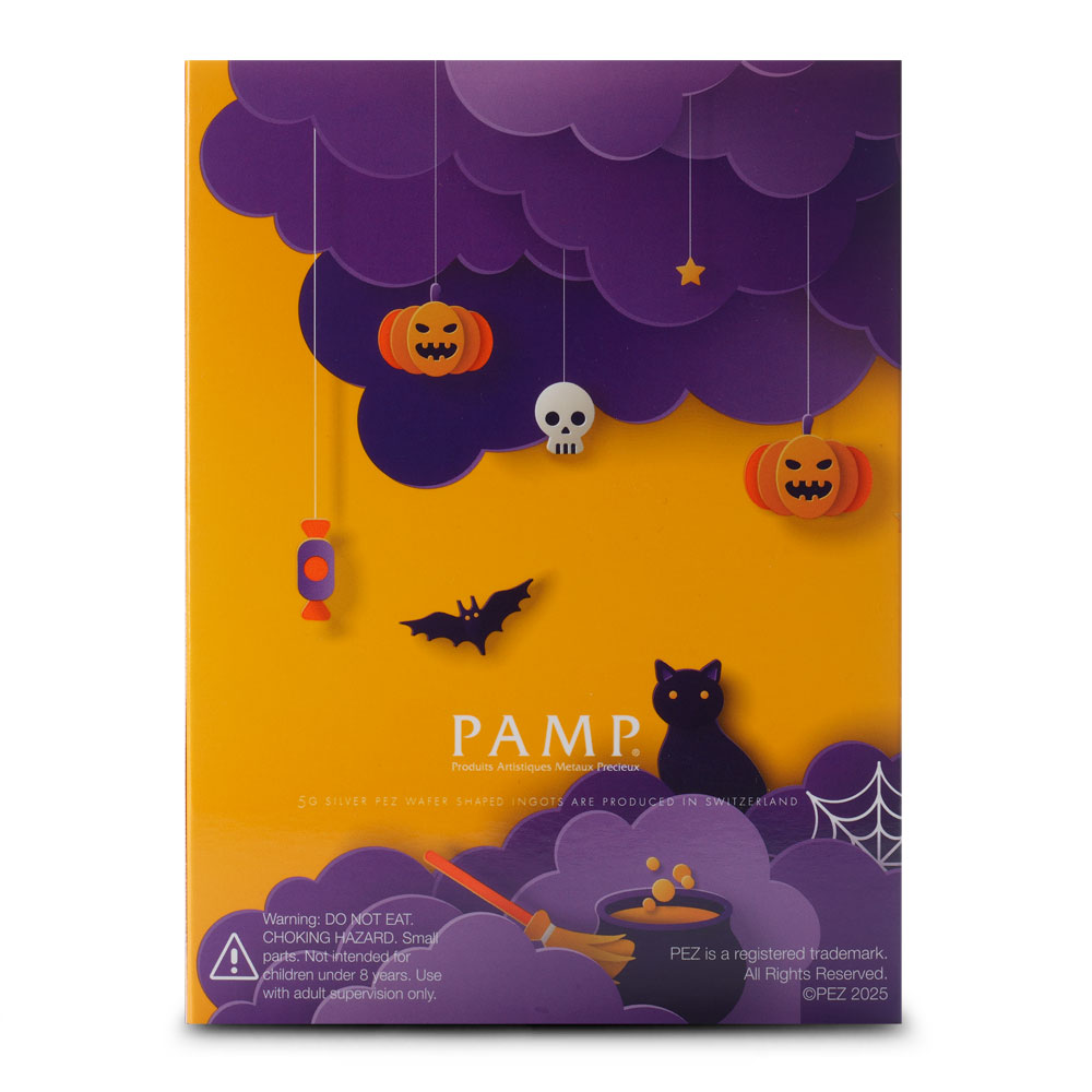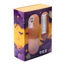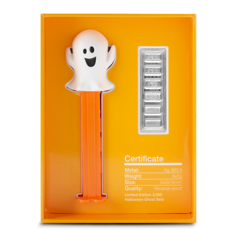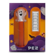Each set arrives in a Halloween-themed gift box with a viewing window. The silver wafers are secured in a capsule, and the Ghost PEZ dispenser is included separately. You can leave the wafers sealed inside the capsule or load them into the dispenser for a unique display option.