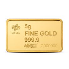 The obverse side of the gold bar presents horizontal inscriptions, including the PAMP Suisse logo, its weight, metal content, purity, and an individual serial number.