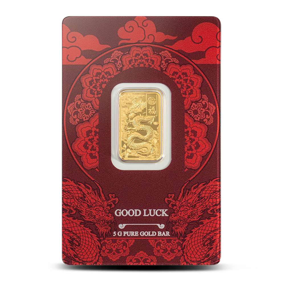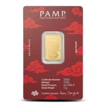 All 5 Gram PAMP Suisse Gold Good Luck Yellow Dragon Bars are packaged within red CertiPAMP assay cards for safekeeping. This bar is part of a two-piece series that also features a 1 oz gold version. Every bar comes with its own serial number for easy identification.