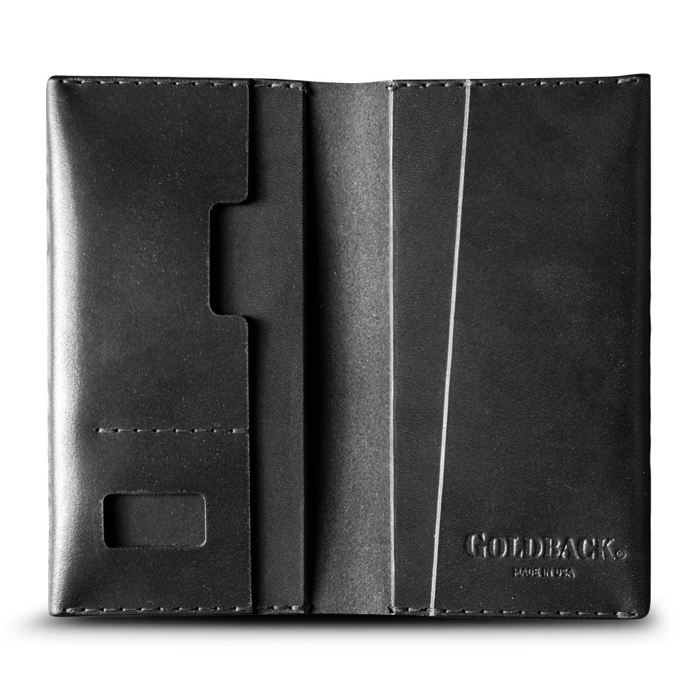 The Black Wayfarer Goldback Wallet offers a blend of discreet design and practical features. Made from durable 6 oz full-grain leather, this wallet is designed to last. Its U.S.-based production ensures quality and care, and the eco-certified, vegetable-tanned leather makes it safe and sustainable.