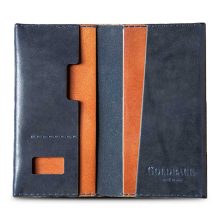 The Navy Blue Wayfarer Goldback Wallet is a great choice for anyone who prefers a sleek way to keep their currency organized. Its built from 6 oz full-grain leather and is designed to be durable enough for regular use. Made in the USA, it features vegetable-tanned leather thats both eco-friendly and long-lasting.